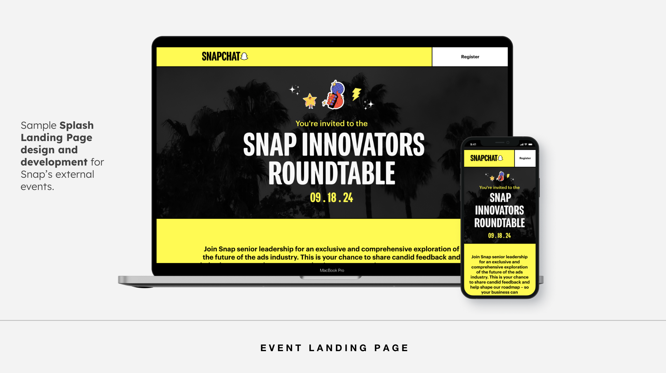 Designed the keynote presentation for Snapchat’s Direct Response Summit for external advertisers, along with event collateral such as email invites + Splash event landing pages.